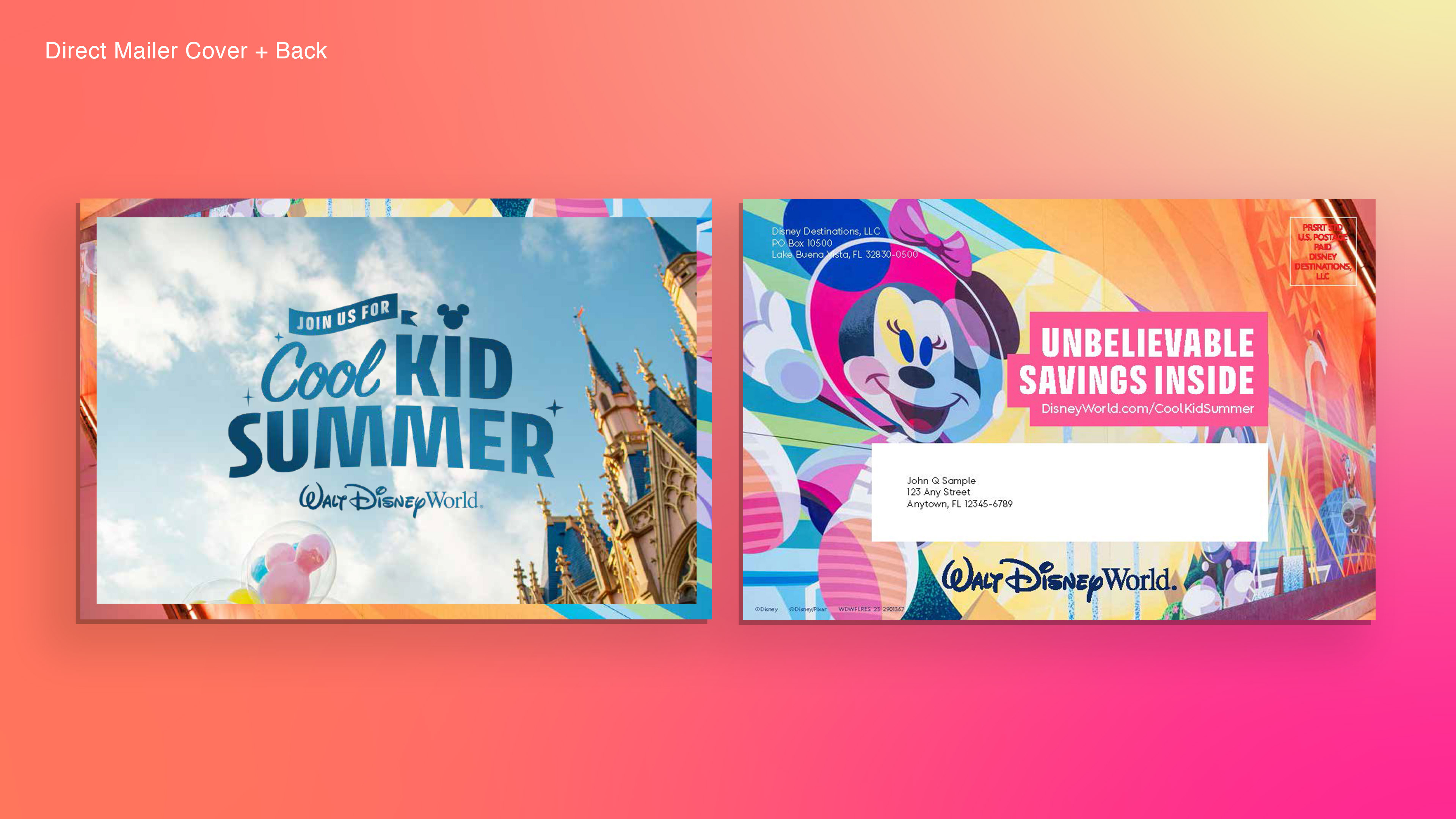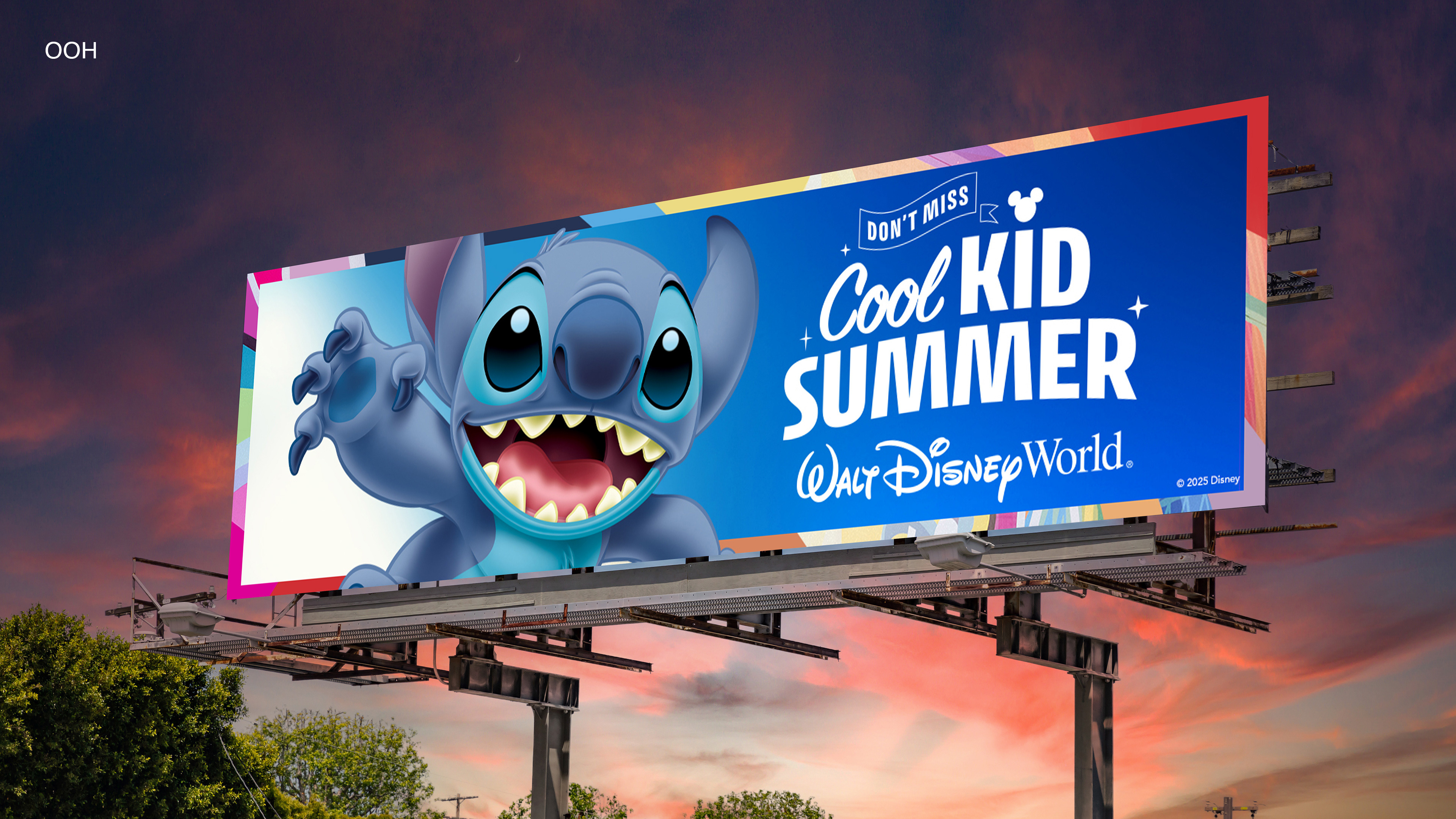 At Disney Yellow Shoes, the Design team was tasked with creating a summer campaign look and feel called Cool Kid Summer. This campaign encompasses the range of experiences occurring at Walt Disney World in the summer of 2025. We delivered a primary logo that was translated into other languages. An awesome summer color palette, that expresses the endless fun of summer. The look and feel of the campaign were consistently applied across out-of-home boards, direct mailers, stadium graphics, and in-park maps. The best part of all is that Stitch became our ultimate kid and the face of Cool Kid Summer for our out-of-home tactics.