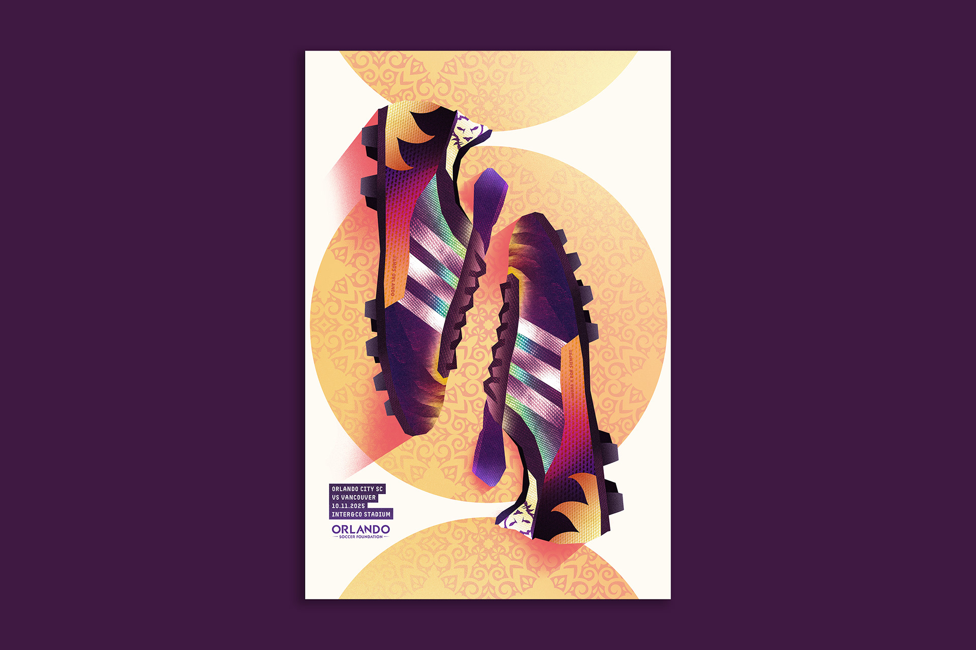 For Orlando City's 11th season, I wanted to highlight something we hadn't seen before: a pair of soccer cleats. This illustration captures the heart of the game – the player's connection to the pitch – set over a vibrant pattern inspired by "Noche Latina." The design celebrates the rhythm, color, and culture and it was a complete honor.
